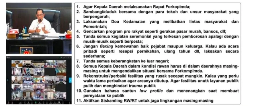 Forum ini menegaskan kembali arahan Mendagri, antara lain penguatan Siskamling, pemberdayaan PKK, pemberian bantuan sosial, hingga penyelenggaraan pasar murah sebagai bagian dari upaya menjaga kondusivitas Kamtibmas.